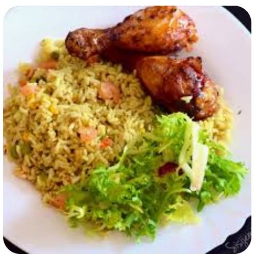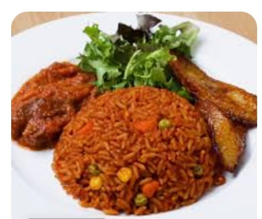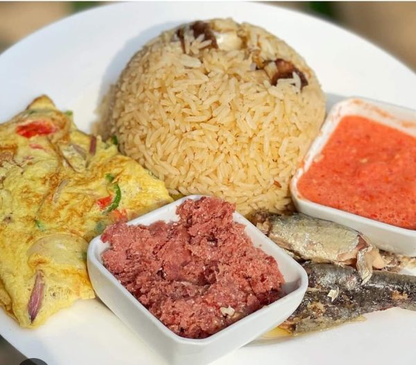 Wakye is typically served with a variety of accompaniments, including fried plantains, boiled eggs, stewed or fried fish, fried chicken, and a spicy pepper