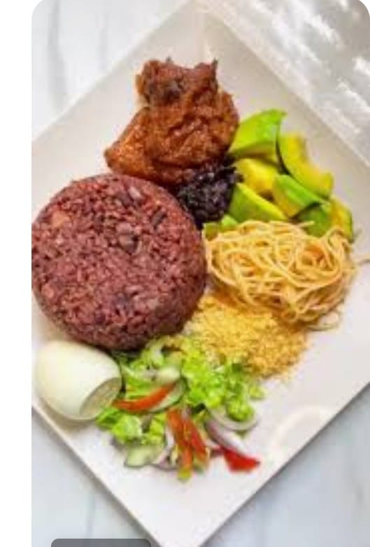 Wakye is a traditional dish that is a staple in Ghanaian cuisine. It consists of cooked rice and black-eyed peas or cowpeas, which are boiled together until tender. The dish gets its distinctive color and flavor from the addition of millet leaves or sorghum leaves, which are boiled with the rice and beans. This gives the dish a reddish-brown hue and a unique taste.